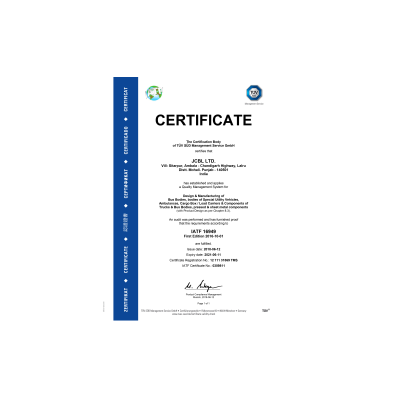 Incepted in 1989 with a vision to manufacture high quality mobility solutions, today, JCBL Limited is a leading and one of the most preferred manufacturer of highly customised mobility solutions in India. With our state-of-the-art manufacturing facilities at Lalru, Punjab, and Oragadam, Chennai, spread over a sprawling area of 1,61,874 Sq. m (total area) , we cater to the requirements of biggest and leading OEMs, Government undertakings like ISRO, DRDO, Ministry of Health, NACO, Ministry of Defence, Ministry of Transportation, STUs, Prime Fleet Operators, Private Business Owners, and many more by producing thousands of customised mobility solutions every year.